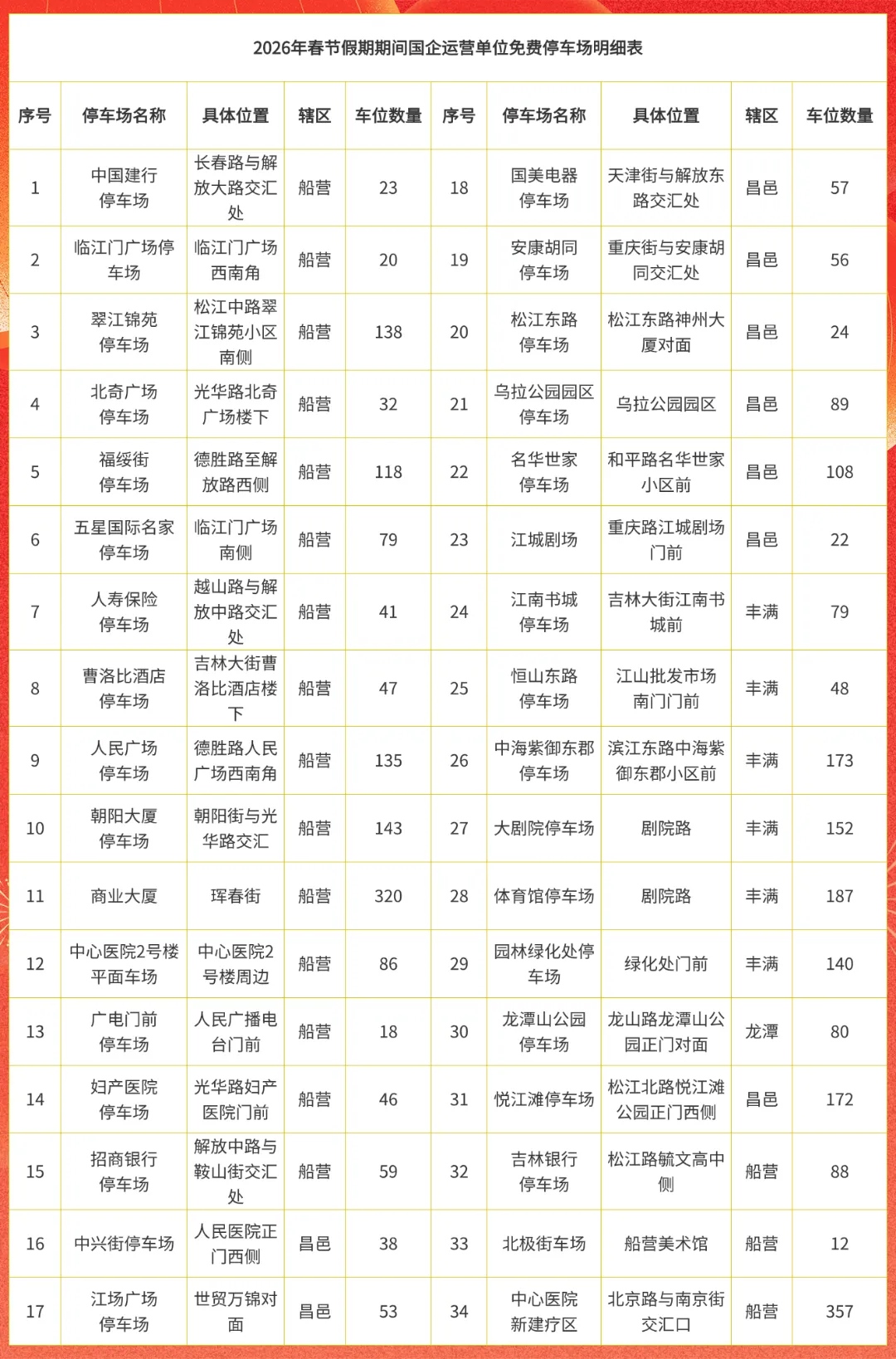 2月15日至2月23日,城区34个国有封闭停车场,共计3240个泊位面向社会免费开放。
