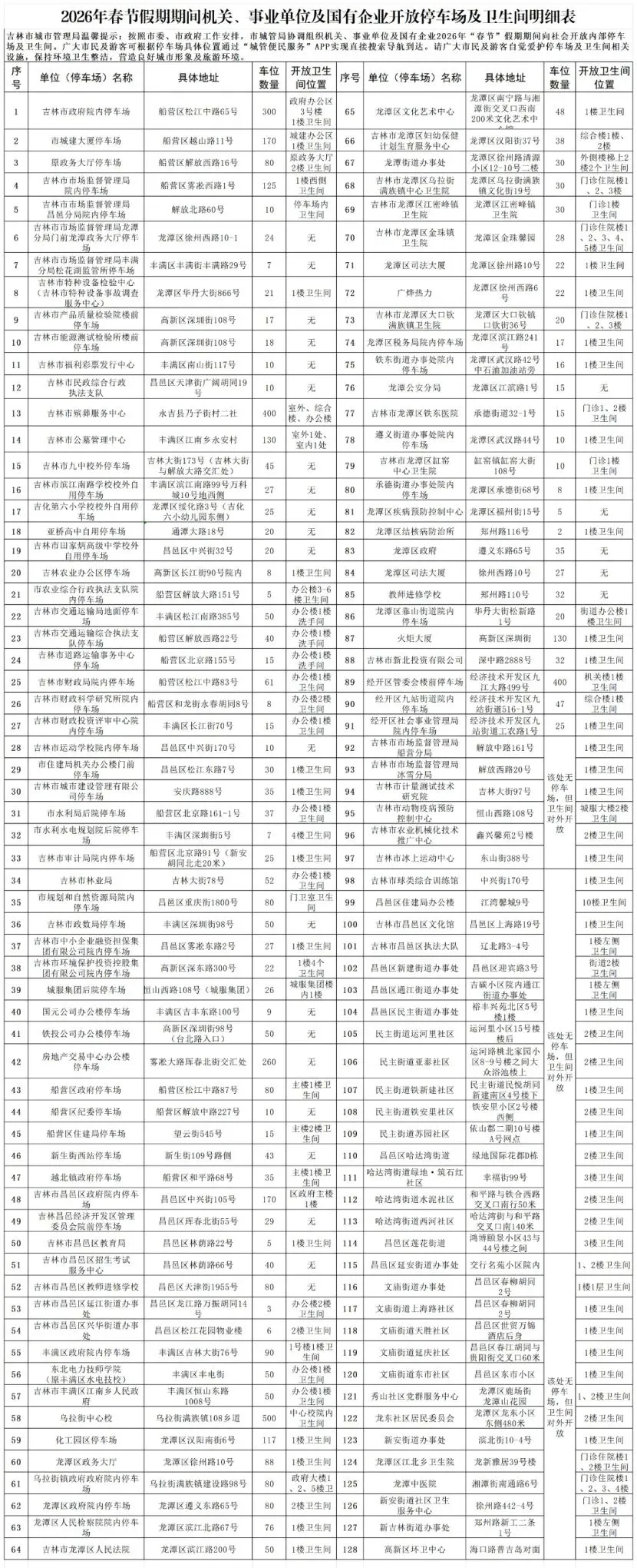 机关、企事业单位自用91个停车场共计5214个泊位面向社会免费开放(部分单位同步开放卫生间)。