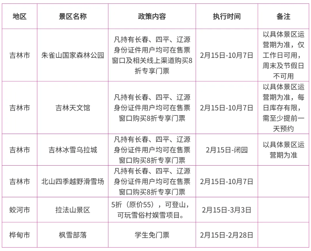 特别推出长春都市圈文旅优惠政策,朱雀山、天文馆、冰雪乌拉城、北山四季越野滑雪场、拉法山等多个景区景点,对持长春、四平、辽源身份证件的游客推出5至8折不等的门票优惠。