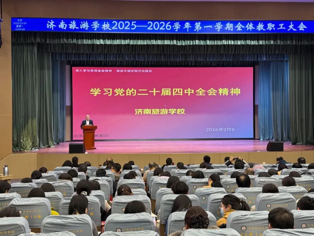 为深入学习贯彻党的二十届四中全会精神,2月9日,济南旅游学校以2025—2026学年第一学期全体教职工大会为契机,组织科级及以下干部教师开展专题学习活动,校纪委书记黄寿友担任主讲。