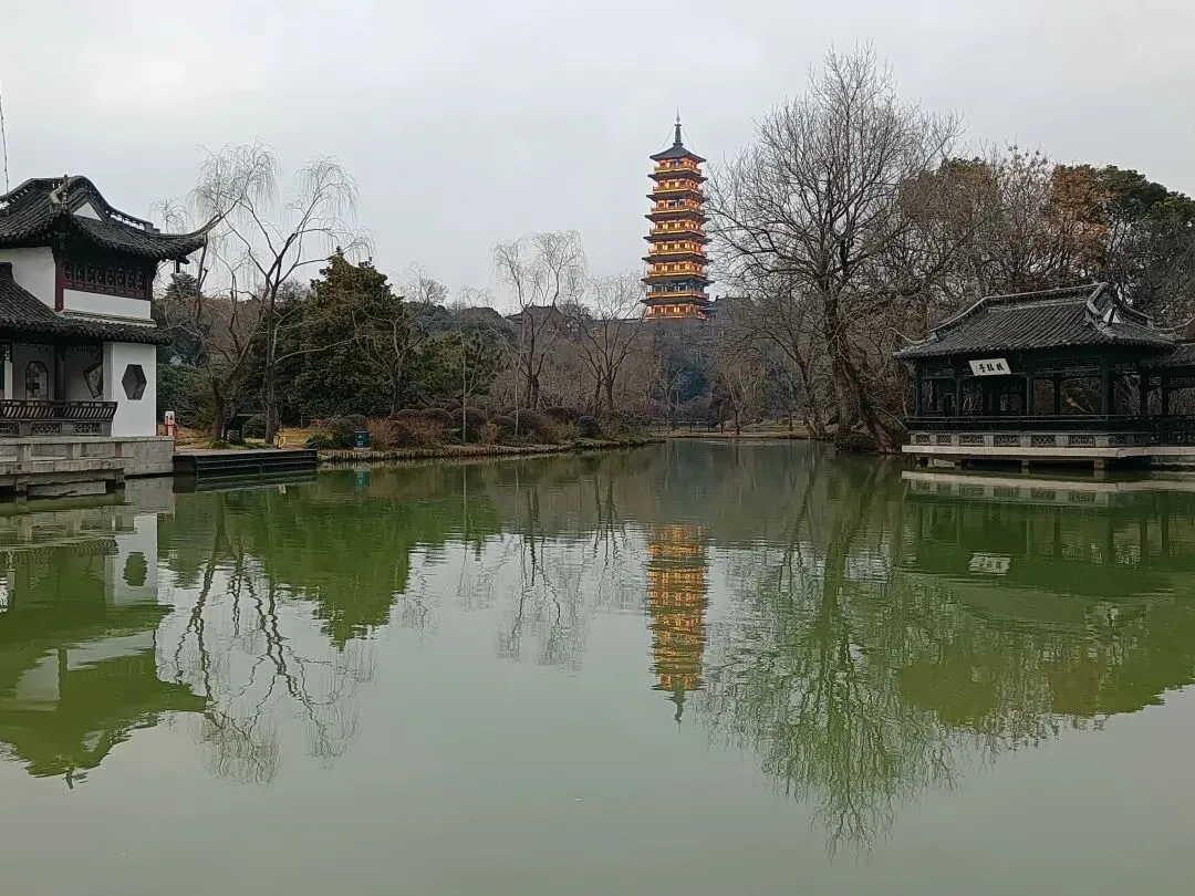 经过一大片树林,到达园林微缩景观区,此时5点多,对面的大明寺塔灯亮起来了,倒影在瘦西湖上,又是一大美景。