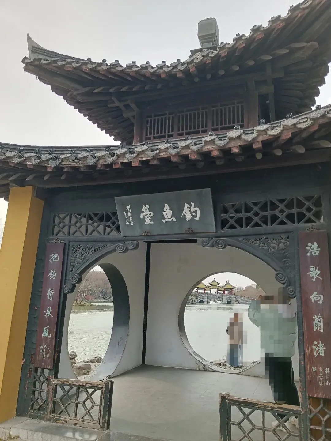 钓鱼台最大的特色在于其独特的框景艺术,站在斜角45度向前看,正洞成正圆,五亭桥横卧波光,如莲花出水;侧洞成椭圆,白塔竖立,如春笋破土。一横一竖,一彩一素,相互对比,构成了一幅极美的图画,加上钓鱼台一景,被称为“三星拱照”。我当时只拍到了远处的五亭桥。