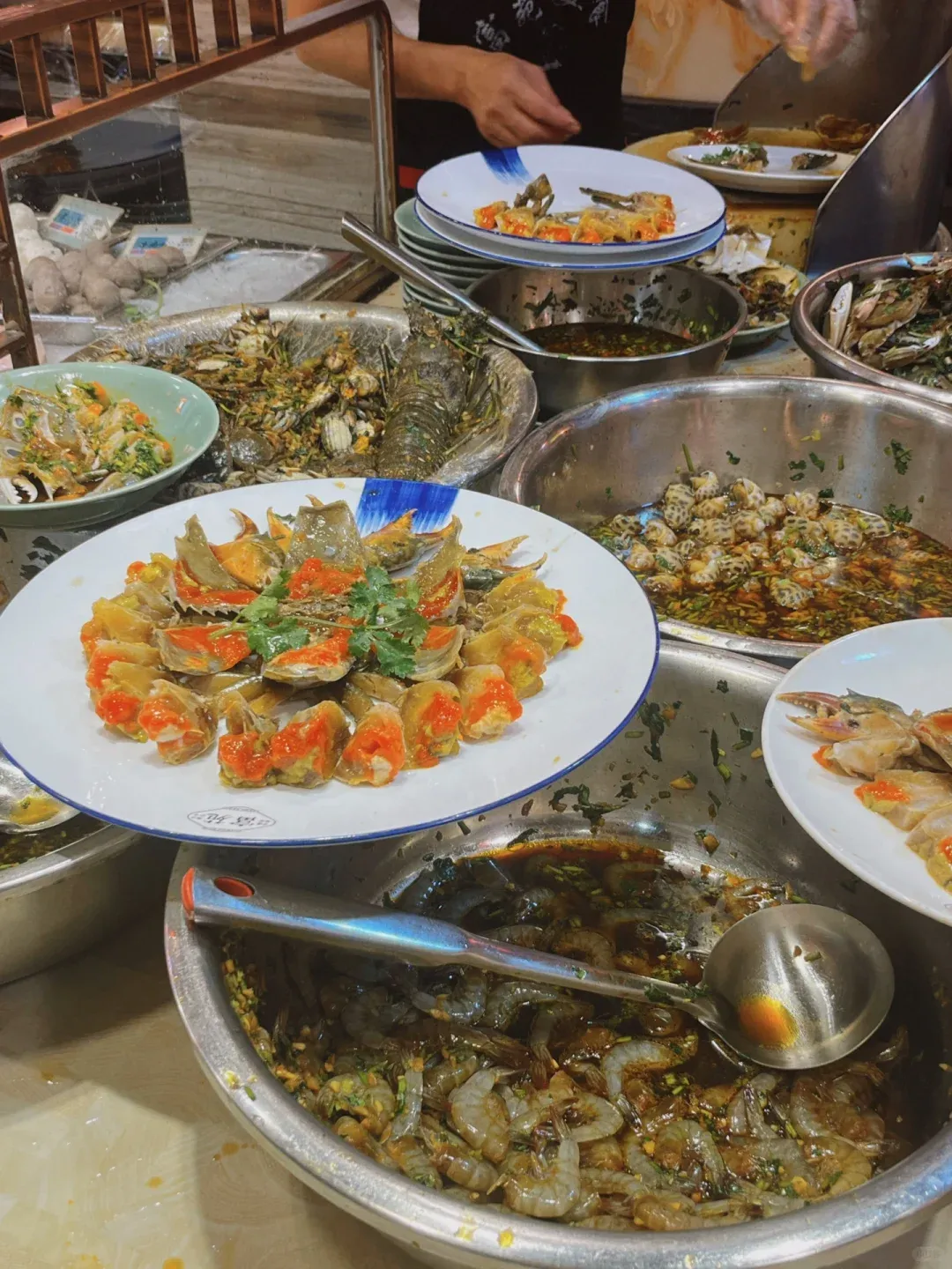 将螃蟹、虾蛄、虾、生蚝、血蛤等海鲜,放入辣椒、香菜、蒜末、酱油等调料腌制一段时间便可以食用了,新鲜的海鲜配上软绵弹滑的口感,让人欲罢不能。