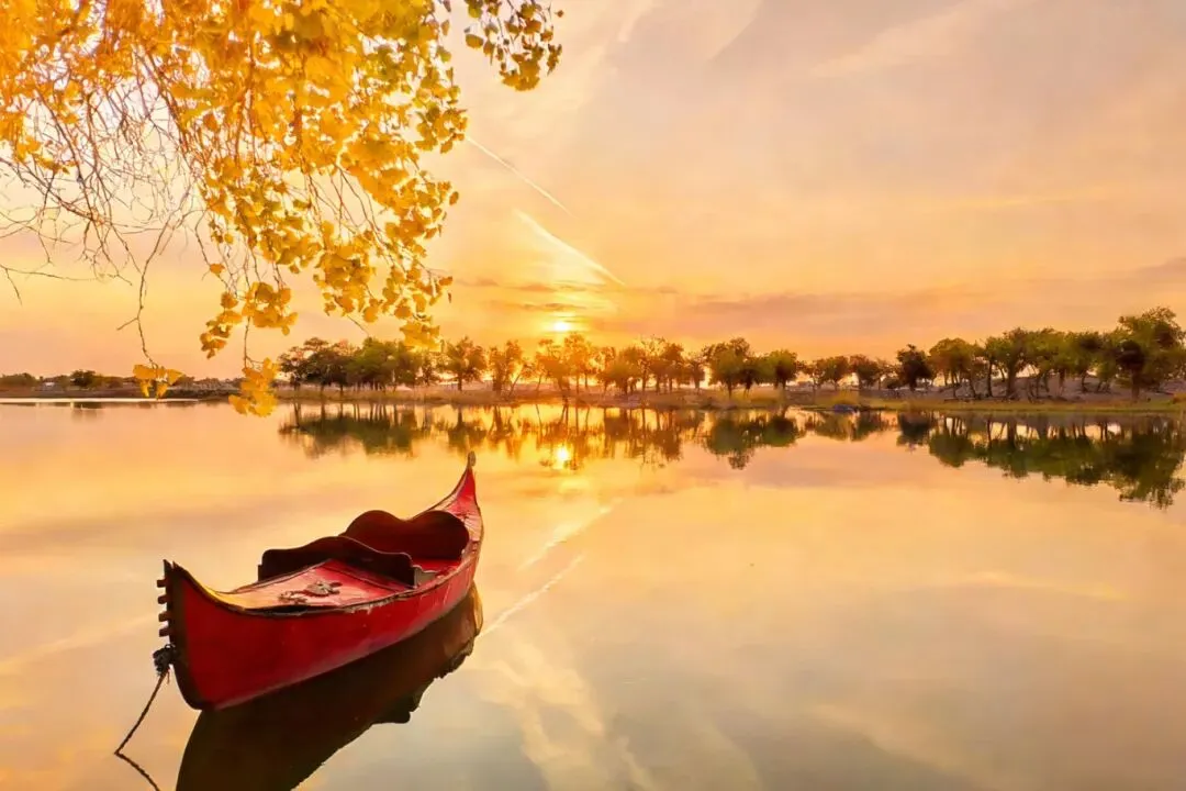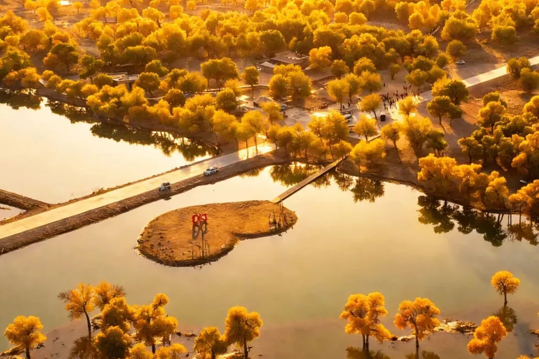 额济纳黑城弱水胡杨林景区:金叶连天铺同心,弱水千年绕誓流.