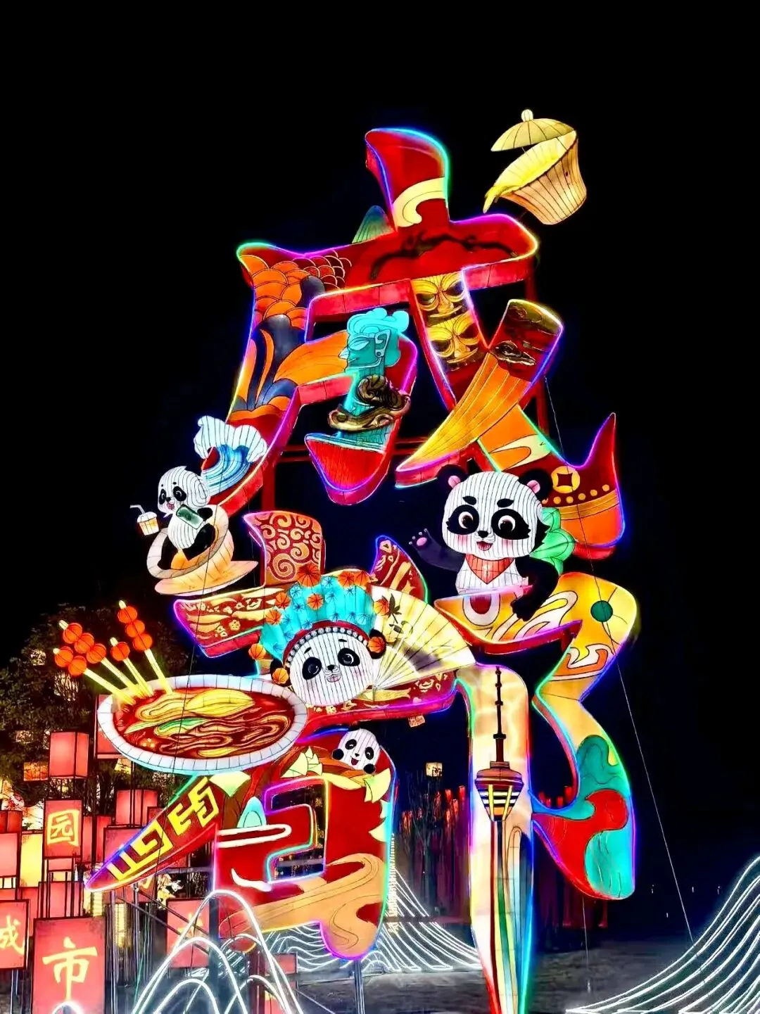 2月7日至3月22日(2月16日除夕闭园),第55届成都国际熊猫灯会在330余亩的溪峰岛上打造“五区一心”璀璨赏灯带。春节期间,将呈现系列主题情景舞剧,举行系列主题巡游,以及非遗打铁花、非遗舞狮、非遗皮影戏、川剧变脸等年俗表演。