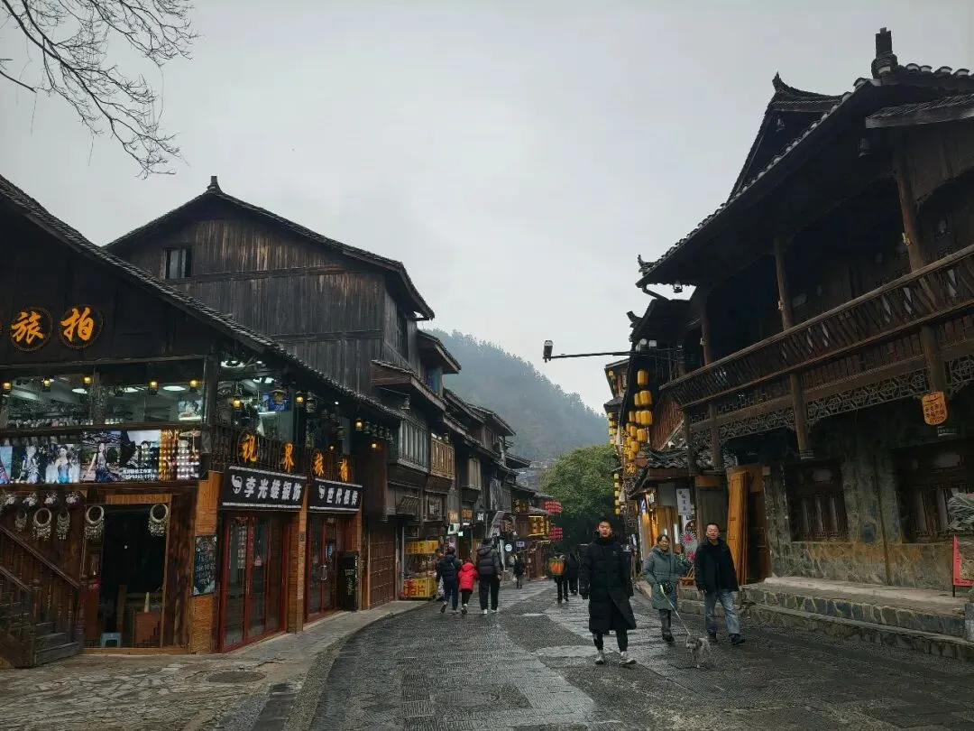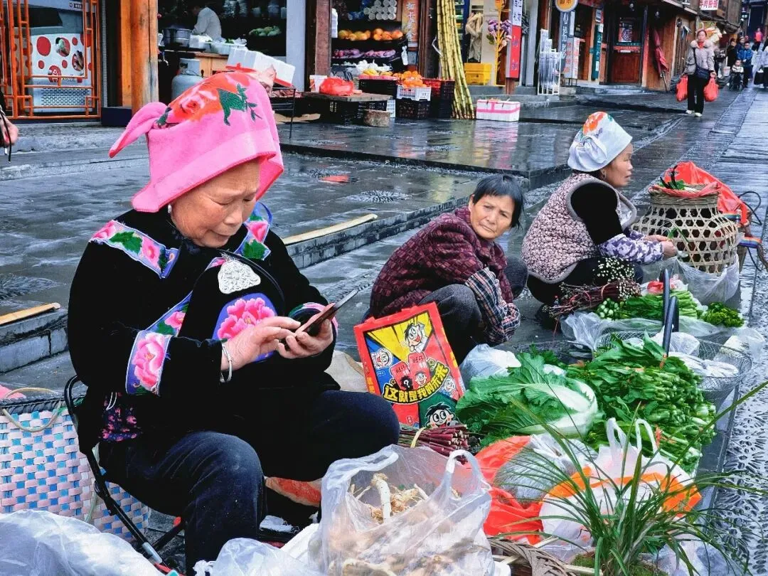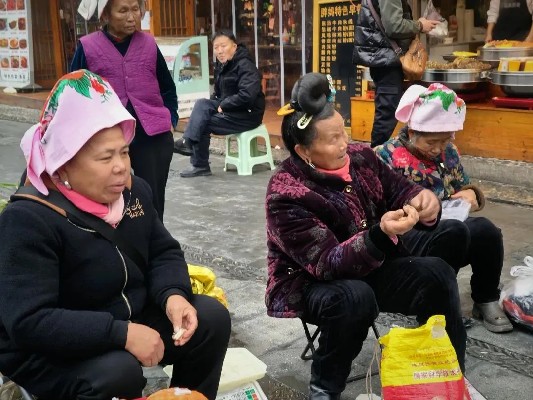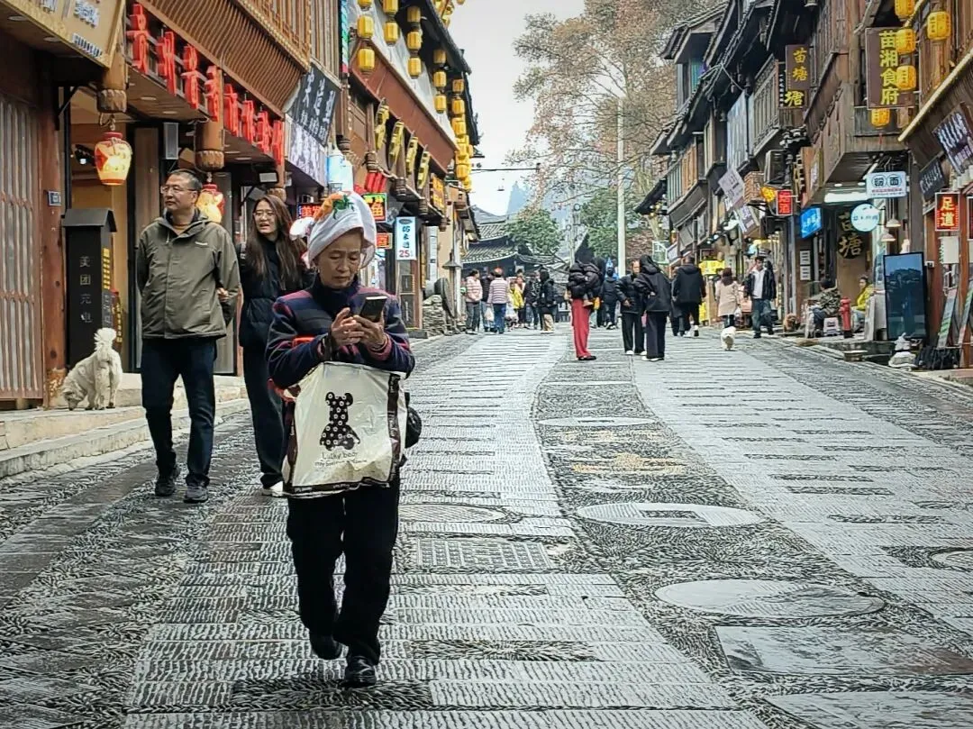 我们沿着石板路往下走。嘎歌古巷里,蜡染坊的蓝靛香味飘出窗外,银匠铺里传来叮叮当当的敲打声,散发出悦耳的声响。西江是著名的银匠村,苗族银饰的工艺之精湛,能让一块平凡的银片在铁锤的挥舞下,变得活灵活现。路边随处可见穿着盛装的姑娘,头上银角高耸,胸前银锁层叠,走起路来环佩叮当,风姿绰约。苗族服饰被称为“穿在身上的史诗”,这些银饰记录着这个古老民族数千年的迁徙密码。