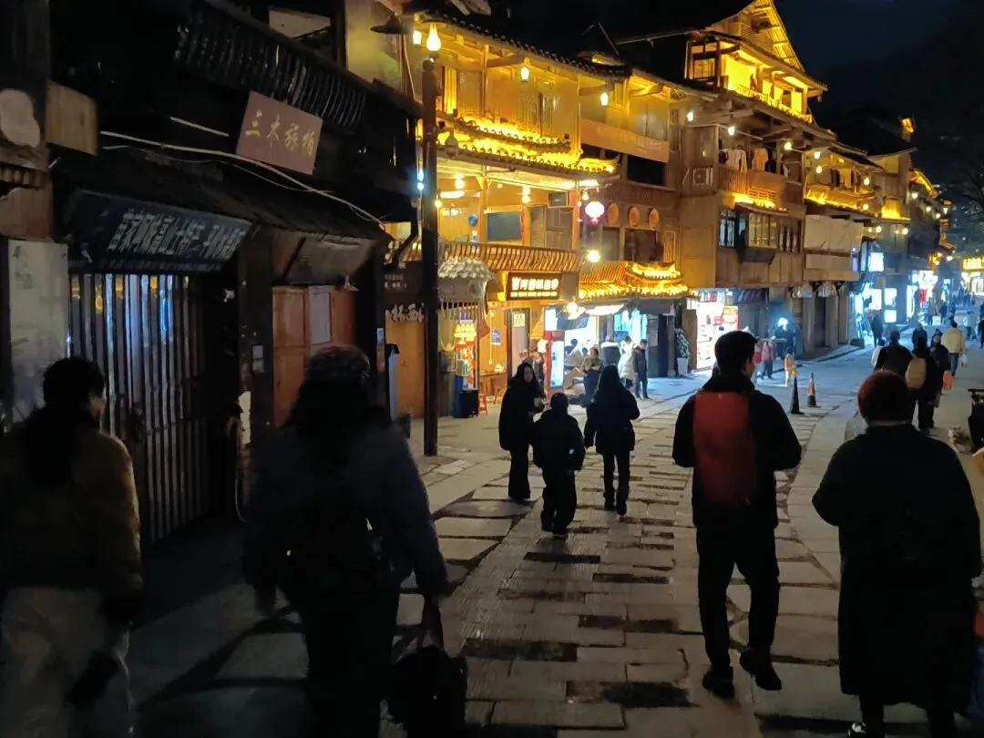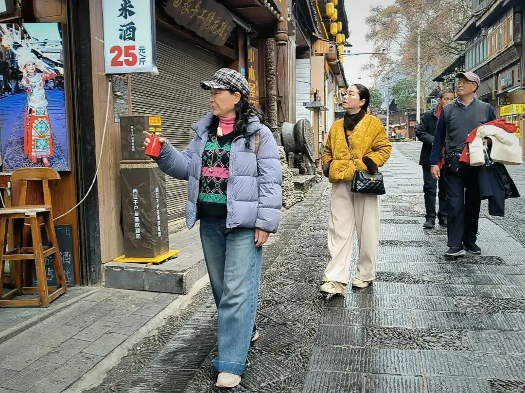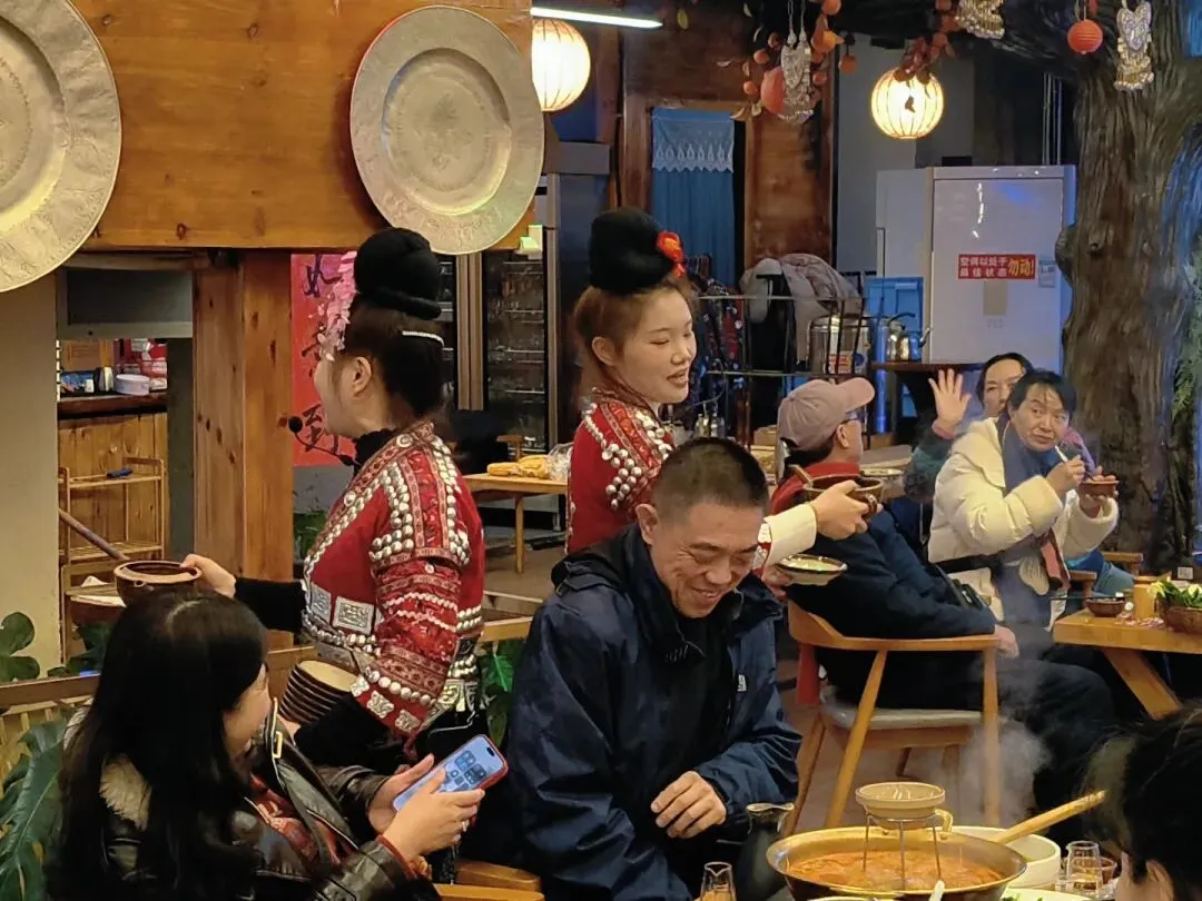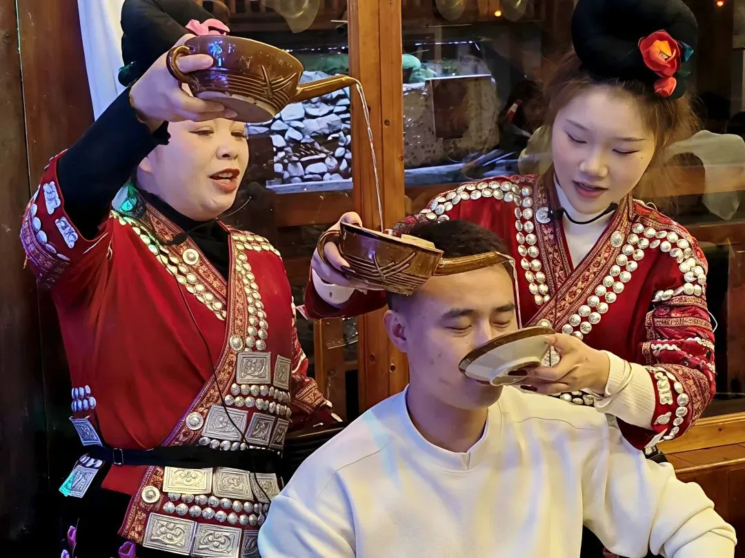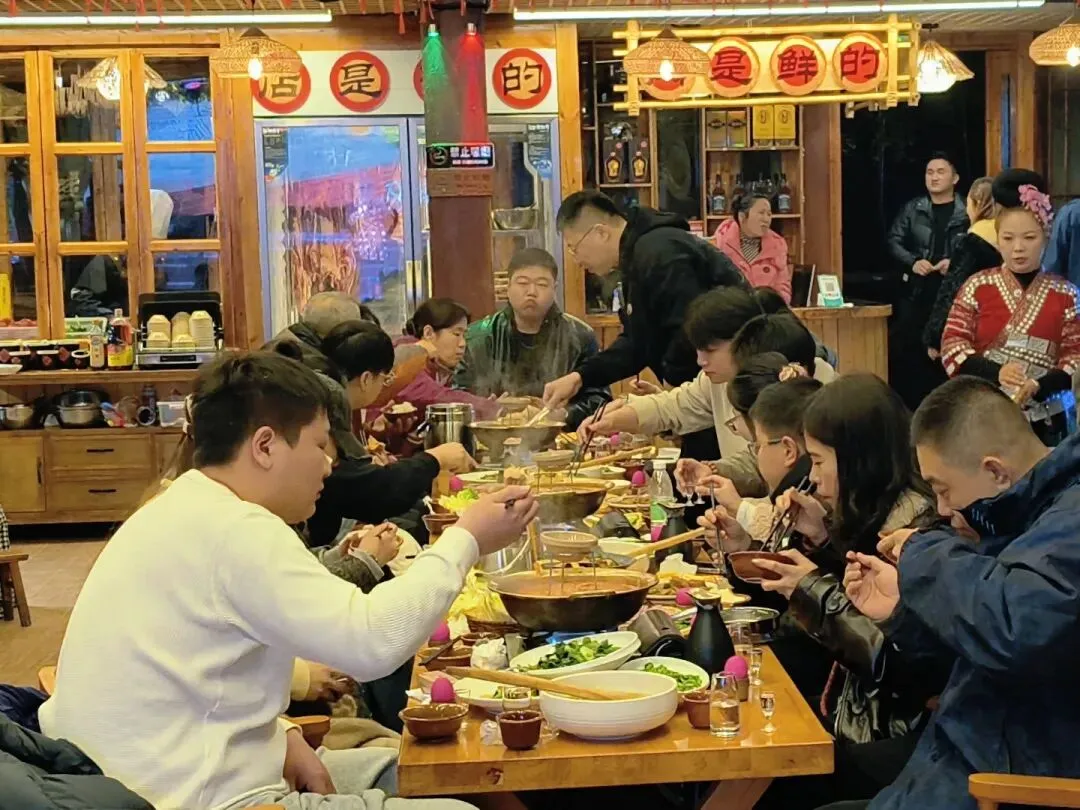 晚饭安排在一家临河的吊脚楼。吃的是酸汤鱼,他们用山泉与配料发酵而成酸汤,配上鲜活的稻田鱼,酸香扑鼻。店家还安排了长桌宴,十几个人排成一长溜,苗家姑娘端着米酒,唱着“管你喜欢不喜欢都要喝”的祝酒歌,酒壶层层叠叠,米酒如高山流水般流入客人的喉咙。这种“高山流水”的敬酒礼,是苗家待客的最高礼仪。酒入喉,歌在耳,这是在接受一场来自山川的祝福,温暖着每一位游客的心。