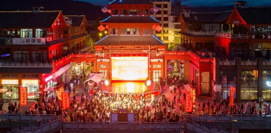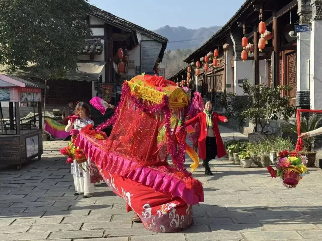 春节期间,古镇准备了精彩的民俗表演:采莲船摇过回龙桥,戏台搭进老街,广场上龙狮起舞,青石板路串起大红灯笼,古街和山水在炊烟里静默如画。