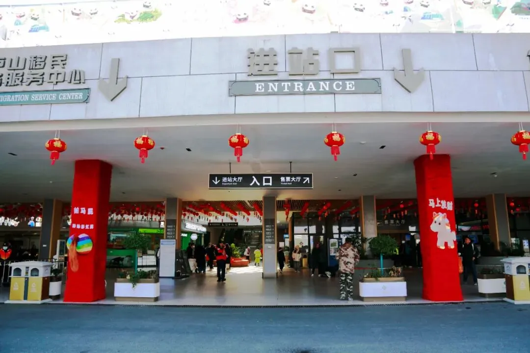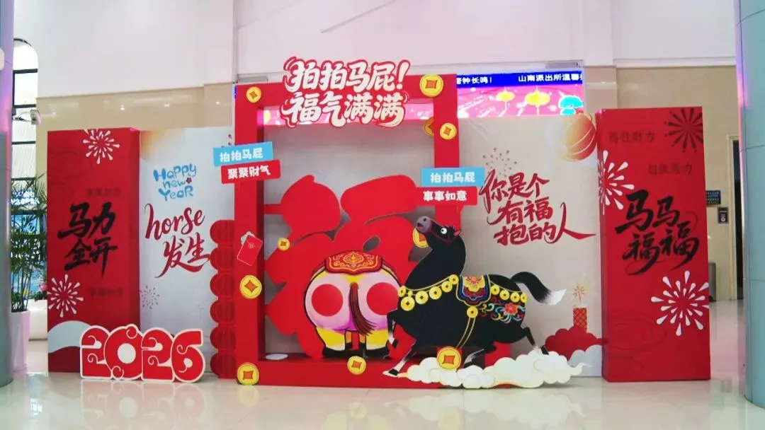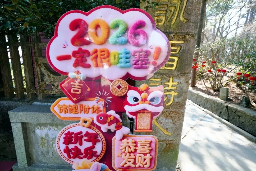 在花径仙人洞景区入口,“2026新年快乐”“马跃福至”“平安喜乐”“福到我家”等新春祝福迎面而来。