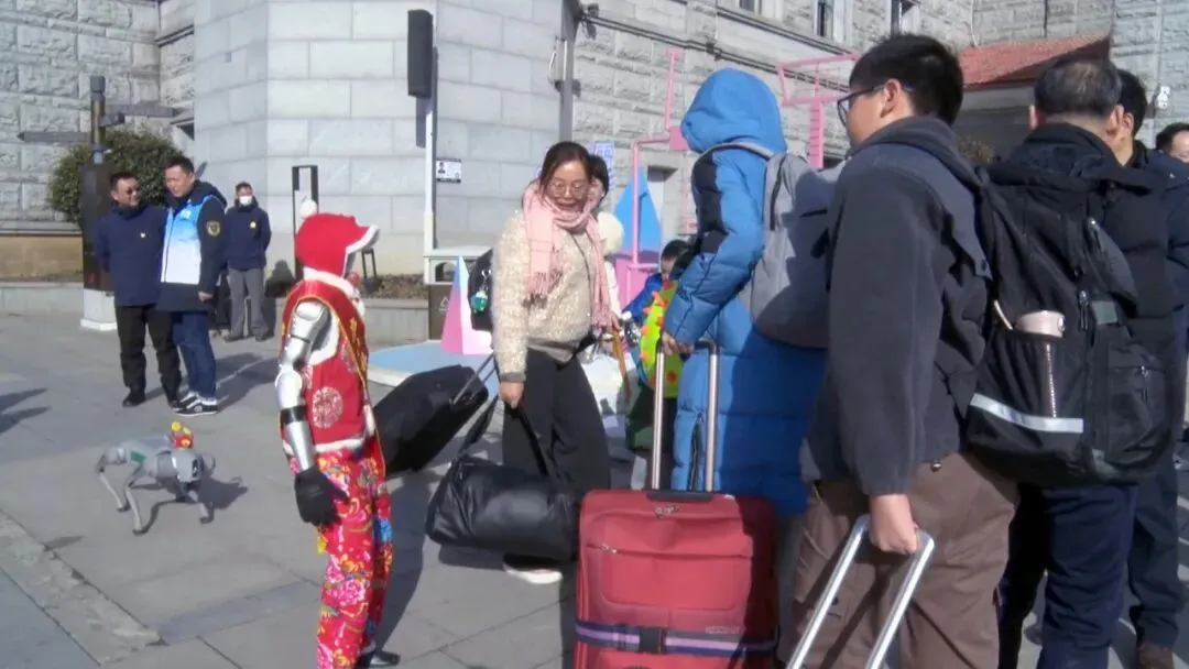 在交通索道下站台,“财神”喜气洋洋欢迎来自五湖四海的游客,俏皮马元素让游客忍俊不止。庐山旅游观光车股份有限公司派出机器人、机器狗“迎宾天团”,“马”上开启宠客新模式,与游客欢乐互动。