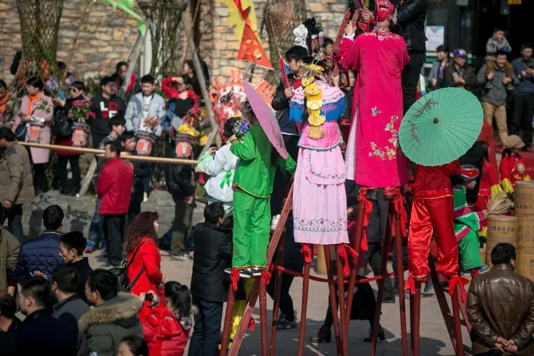 绝活:“单脚跳、跨高凳、后空翻、叠罗汉”,甚至有艺人踩着1.5米以上的高跷连续劈叉或翻跟头落地