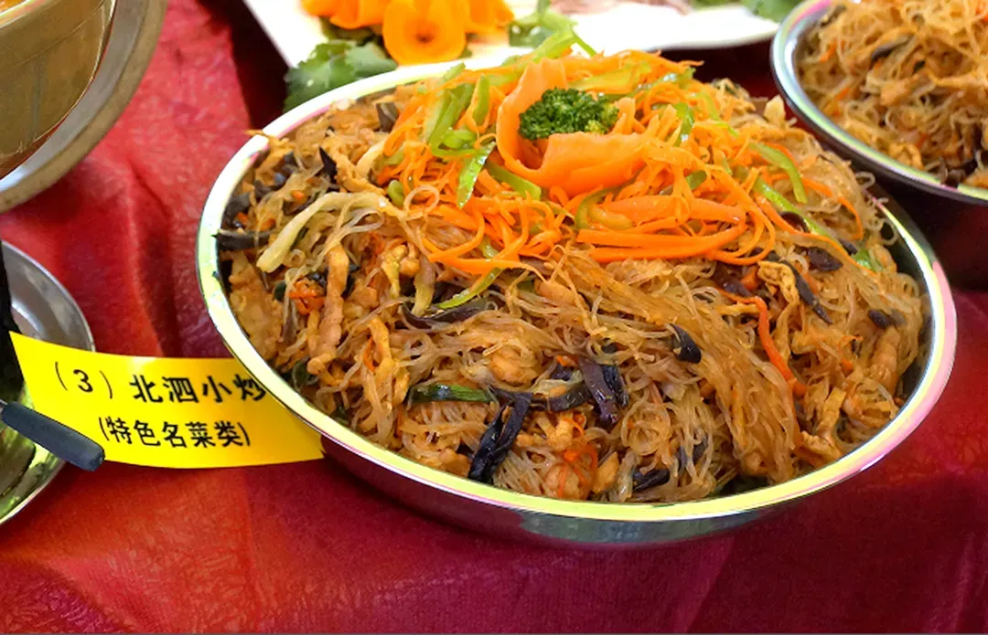 北泗小炒:北泗小炒选料严谨、制作精细、加工讲究,而且注重配色,是由粉丝、白菜丝、猪肉丝、木耳丝、萝卜丝等食材炒制而成的一道农家菜。炒制完成后,色泽明快、和谐、适度,口感纯正,香、润、爽口。由于加入葱姜酒调制的酱料一起炒,味道惹人喜爱,味道香浓、开胃无比。此菜香味地道,为北泗地区饭桌上的家常菜,更是婚宴酒席及招待客人必备菜肴之一。2025年获文化和旅游厅评为广西非遗特色美食大赛“城市必吃榜”菜肴。