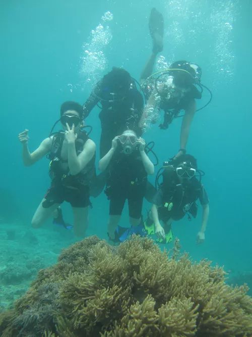 水下是一对一教练跟着,在水下你什么都不用做,教练会拉着你,帮你清理潜水镜里的水、调节或检查你氧气罐上的气压什么的,还会时不时对你比手势,时刻监测你是否适应水下。