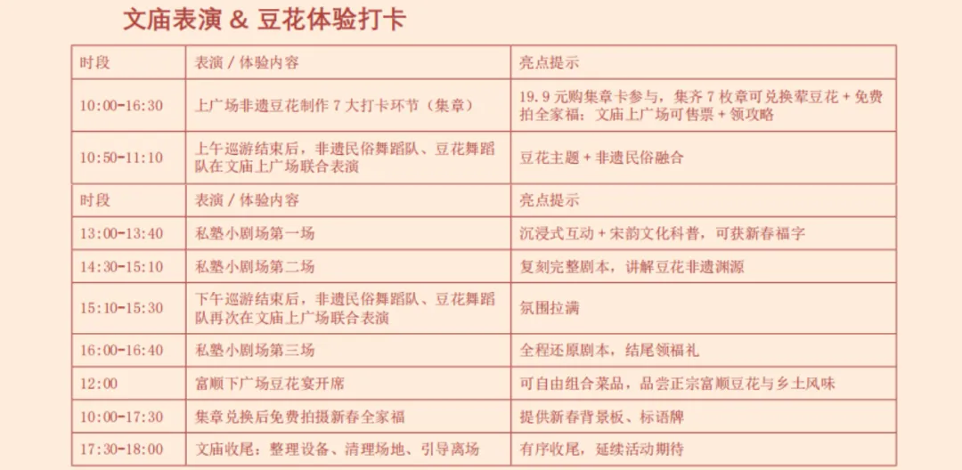 别错过:每天还有三场文庙私塾剧场(13:00/14:30/16:00),文庙内开演,带你沉浸式体验宋韵文化、了解豆花非遗渊源。中午12:00下广场豆花宴开席,更有富顺乡镇特色美食可自由搭配,等你来品尝!