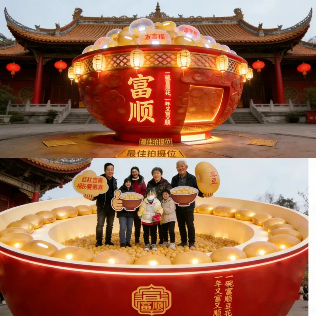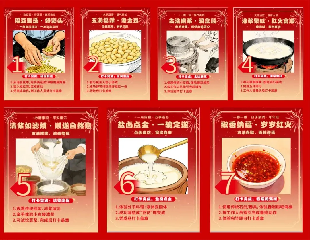 玩什么:这里是整个活动的灵魂所在!花19.9元购买集章卡,即可体验非遗豆花制作七大打卡环节——从“福豆甄选”到“百味调喜”,每个环节都配有寓意吉祥的互动设计。集齐七枚印章,就能兑换一碗热腾腾的荤豆花,登上巨型豆花碗可拍摄C位出圈神图!