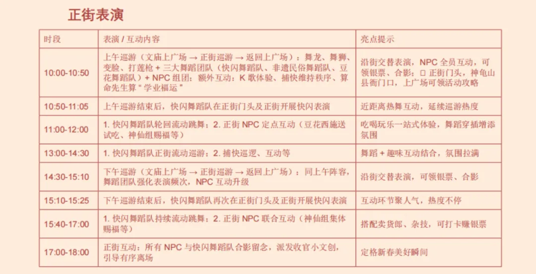 玩什么:这里是巡游主阵地!每天上午10:00-10:50和下午14:30-15:10,舞龙舞狮、变脸、打莲枪与三大舞蹈团队组成巡游队伍,与沿街NPC(豆花西施、捕快、算命先生等)互动,可领银票、合影留念。