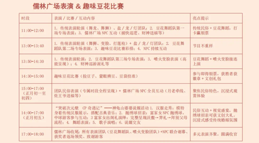 别错过:正月初五14:00-17:00特别举办“突破次元壁·CP奇遇记”,汉服走秀、抛绣球招亲、出阁礼演绎等活动将氛围推向高潮。