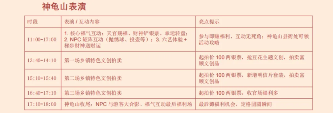 玩什么:主打祈福与拍卖!11:00-17:00持续开放天官赐福、财神铲银票、幸运转盘等互动项目,参与即赚福利。每天三场富顺文创和乡镇特色产品拍卖(13:40/15:10/16:40)起拍价100两银票,可抢购豆花主题文创。
