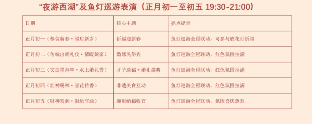 玩什么:每晚19:30-21:00的“唱响西湖”是必打卡项目!初一祈福迎新、初二婚嫁民俗、初三才子婚礼、初四灶神美食、初五财神收官。搭配鱼灯巡游、花船演绎,形成湖岸联动的立体景观。