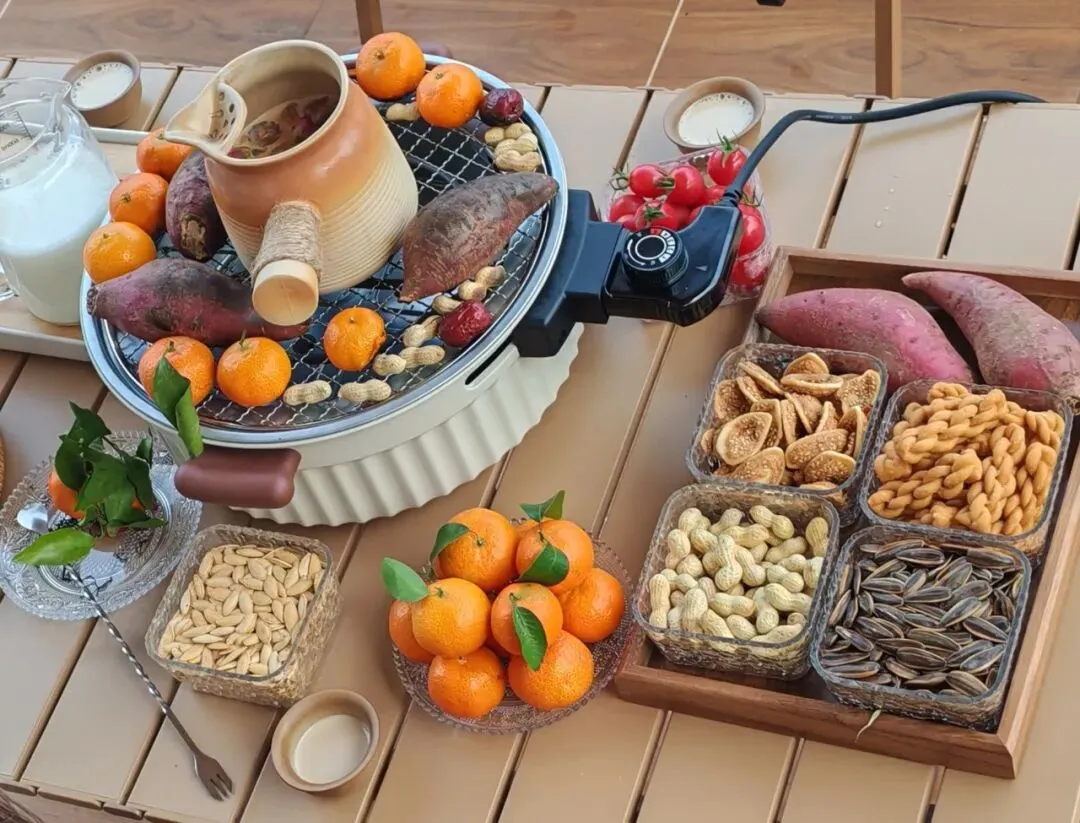 四季风物皆可入炉。冬有雪境造景,烤橘暖茶,慢煮古镇光阴。