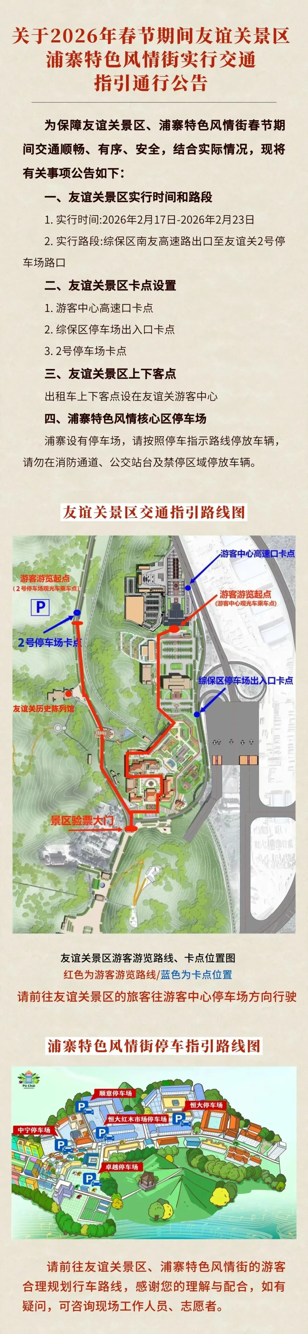 前往友谊关景区、浦寨特色风情街游玩的旅客朋友,如遇交通拥堵请参考下面的路线合理出行,听从现场交通警察指挥,确保安全畅通出行。