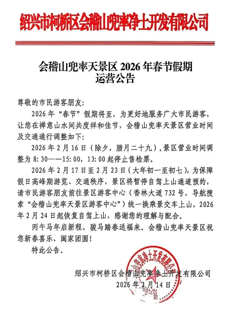 2026年“春节”假期将至,为更好地服务广大市民游客,让您在禅意山水间共度祥和佳节,会稽山兜率天景区营业时间及交通通行调整如下:
