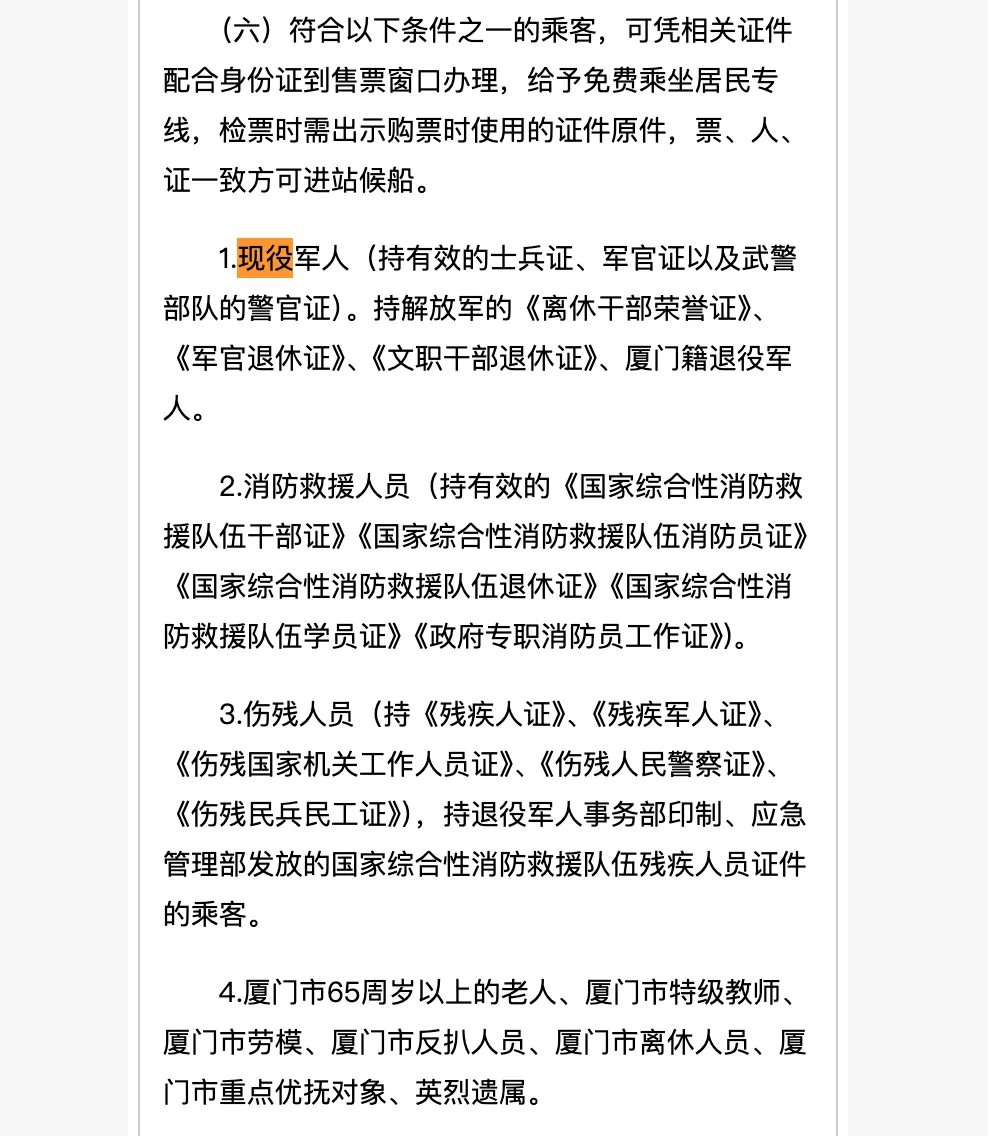 快过年了,好多战友也有旅游的计划,有些朋友打算来福建旅游,问阿乐关于厦门旅游的攻略。阿乐想了想,好像还真有很多独家绝密的宝藏攻略要分享给大家,很多都是网上很难查到的东西,希望对战友们有些帮助。 一、现役旅游优待方面(部分退役可适用) 首先,鼓浪屿是基本每个初到厦门旅游的人,必去的地方。阿乐也很喜欢这个小岛,虽然近两年商业化有些过了。但在淡季的傍晚,在岛上走走,听着钢琴声,还是有特别的感觉。个人建议,如果初次来厦门,可以岛上住一晚。 上鼓浪屿需要坐船。坐船的码头有两个,一个是轮渡码头(靠近市中心中山路对面),一个是东渡码头(距离比较远的游客码头)。 重点来了!现役军人本人可以凭证件在轮渡码头,日间夜间随时都行,坐市民轮船,不用预约船票,直接1号窗口,凭军人证可以换取免费门票,而且可以带随行的家属(家属窗口直接买票就行),阿乐亲测有效,而且军人荣誉感一阵拉满! 这趟操作下来,至少可以节省小半天的坐车和排队时间,而且随时随地能上岛,随时随地能出岛。只是这个操作知道的人不多,官方也不敢大肆宣传,毕竟轮渡压力很大。阿乐之前很多战友都到东渡码头买票,军人只能优惠票(35元),而且还要抢票,还得排队,你说这信息差大不大。