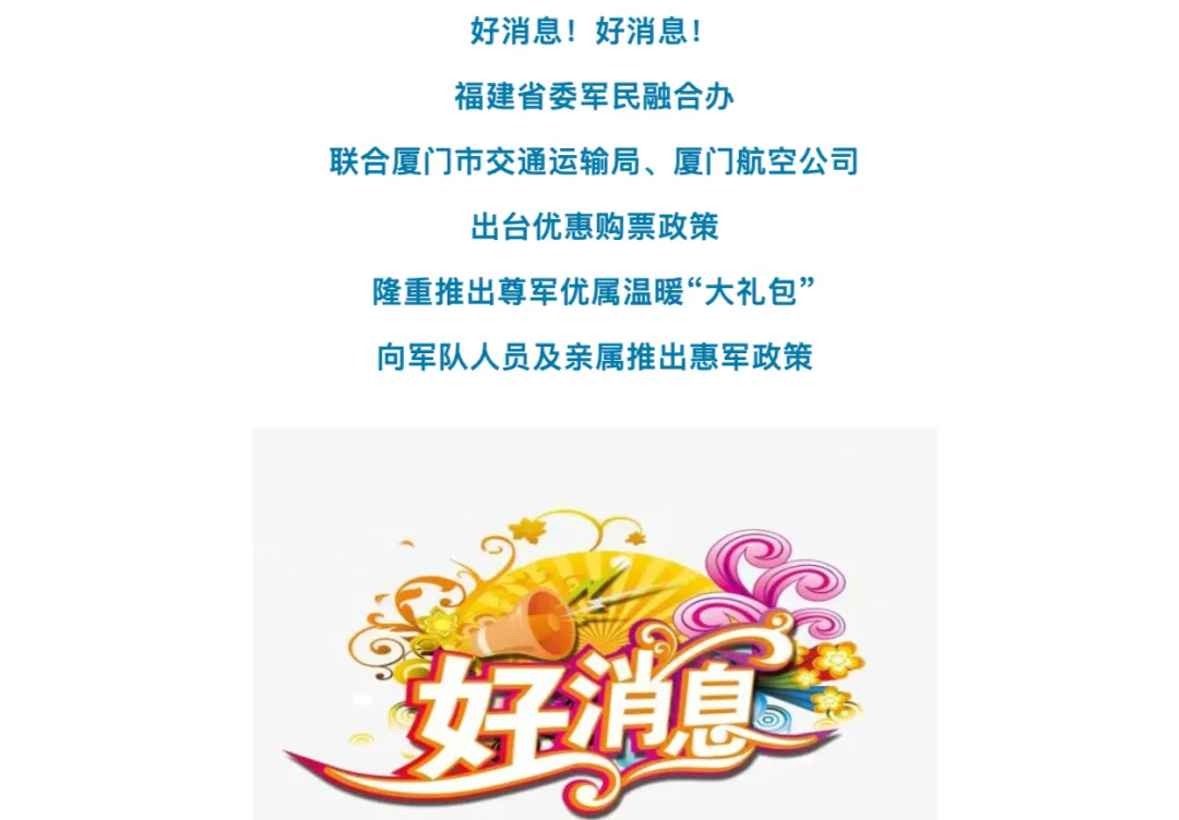 厦航对军队人员出行推出三重专属优待,这个解放军报都宣传了,很靠谱!一是票价折上折,市场 4.2 折以上经济舱及全价两舱,再享8.5-9.5 折优惠;二是专属礼券,注册用户及亲属每年获2000 元机票、餐食、退改签等抵扣券;三是免费退改签,针对因公出差,提供限定条件下的免费退改签服务。具体操作需要联系一下厦航官方客服。