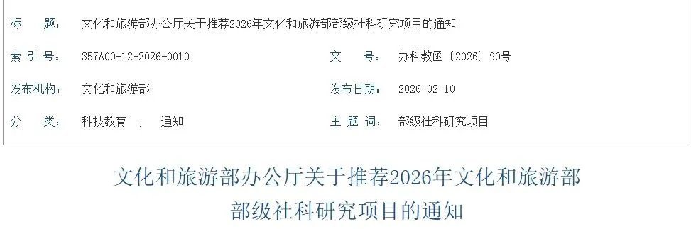 我部将于近期开展2026年文化和旅游部部级社科研究项目申报与推荐工作。现就有关事项通知如下。