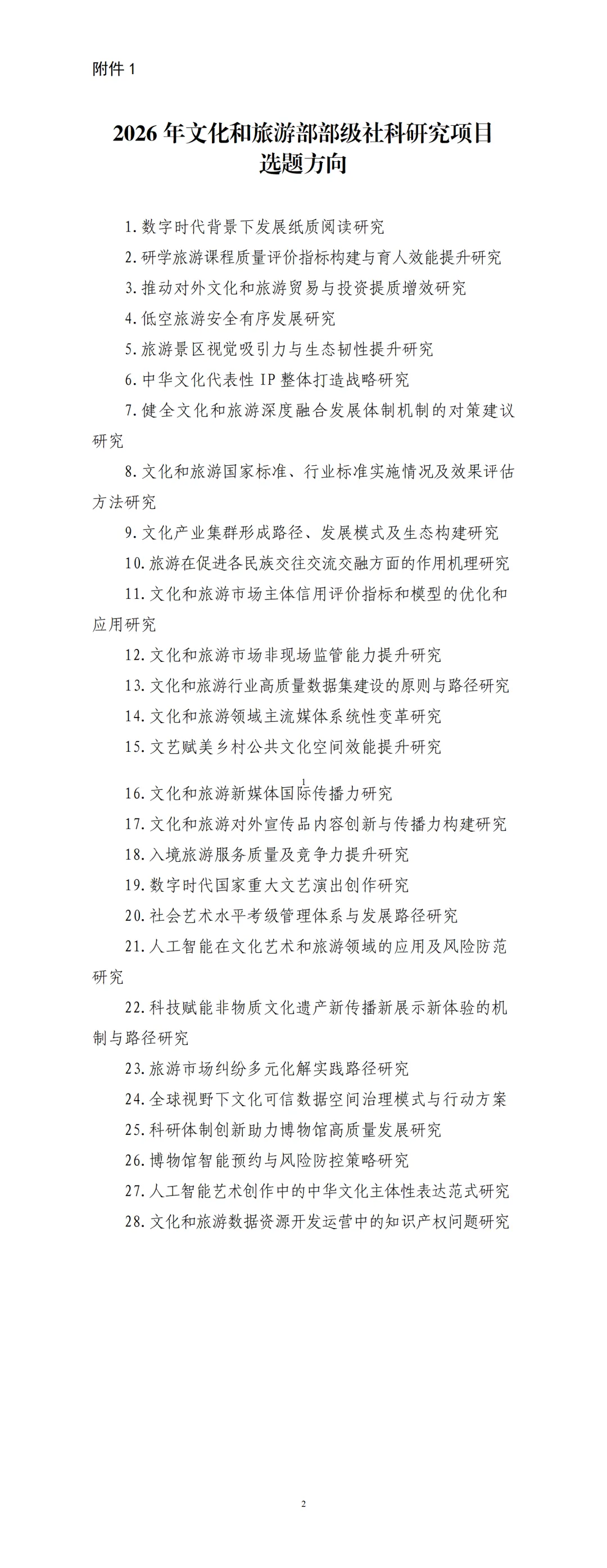 经选题征集、论证,结合文化和旅游发展重点工作任务,确定了28个2026年文化和旅游部部级社科研究项目选题方向(见附件1)。申报人需根据选题方向及自身研究优势,确定对应的研究角度、方法和侧重点,选题的文字表述可做适当修改和细化。