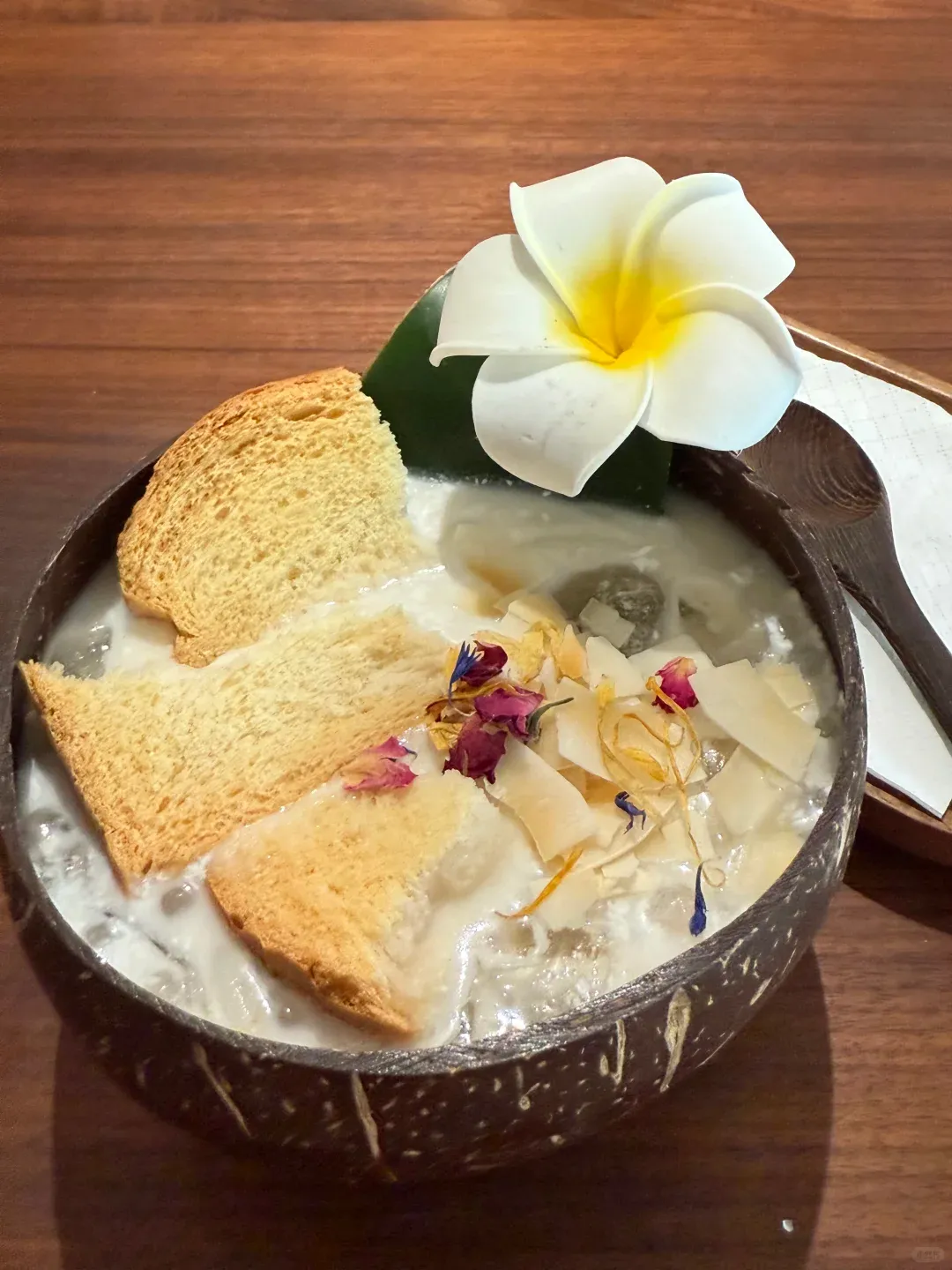 这是源自缅甸的甜点,大块的干面包干酥脆香,浸泡在浓郁的椰奶之中,再撒上椰丝和紫米,面包吸满了奶香,在软脆之间入口,清甜不腻,超好吃!