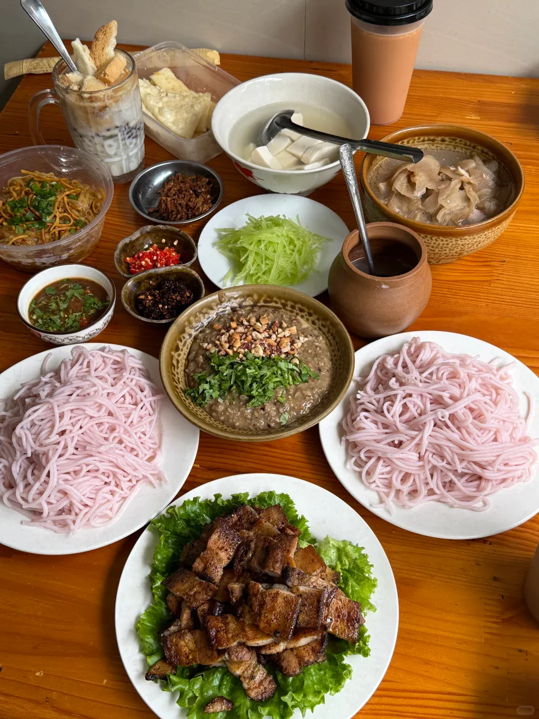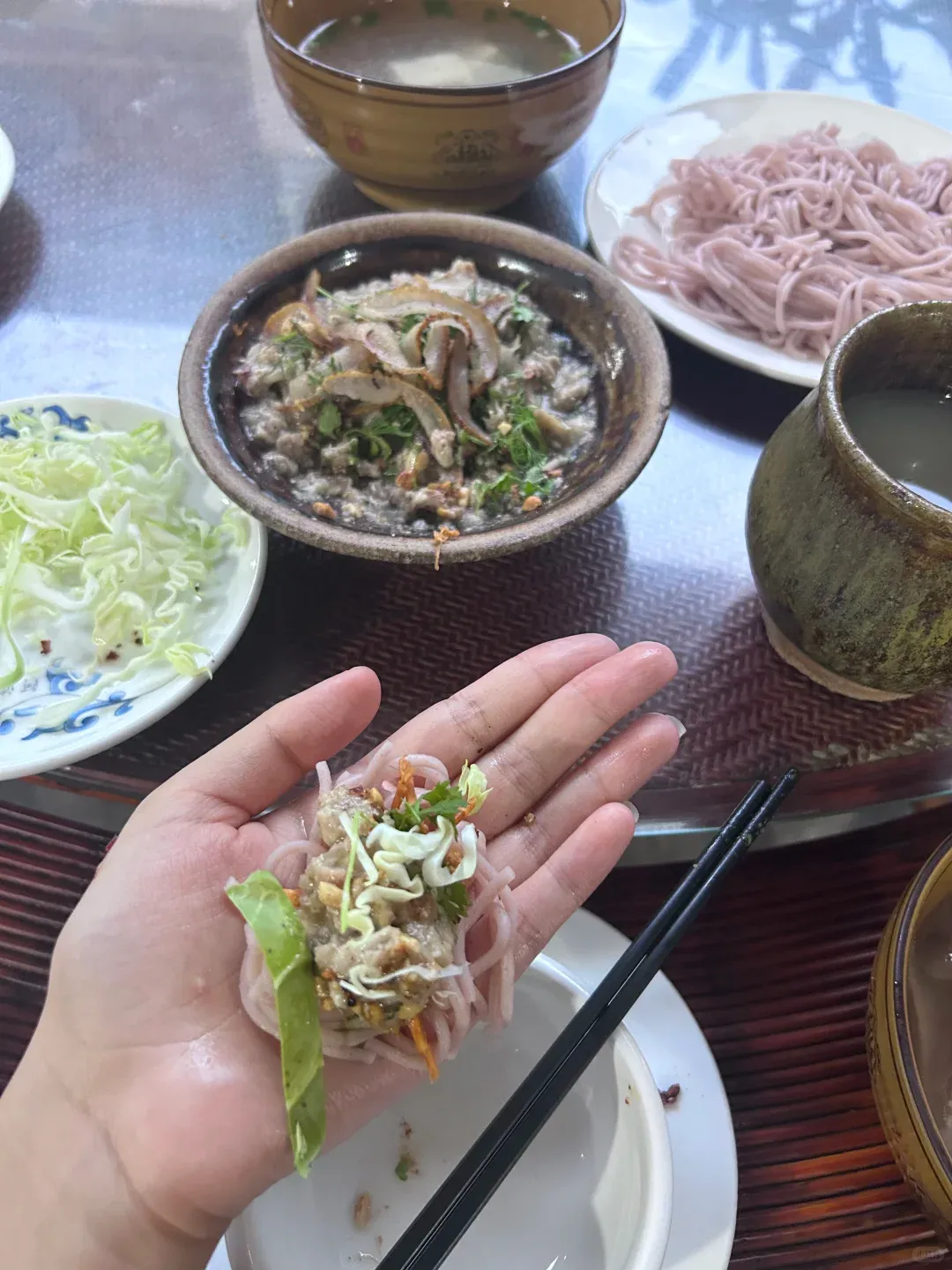 最有意思的是吃法!不用碗,抓上一团米线放在手心,摊上一层厚厚的肉馅!入口的一瞬间,肉的焦香,酸浆的清爽,米线的温润之感在舌尖炸裂!太香了!
