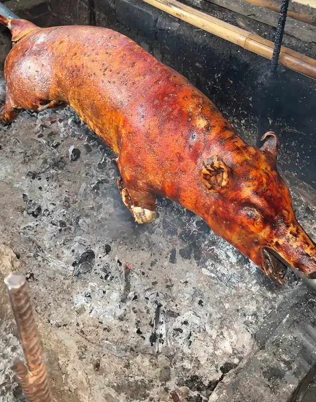 选用当地的小耳朵猪,抹上秘制香料,放在炭火上不停的翻转,这个火候,真的如果不是有几十年的老匠人,是无法驾驭的!烤好的猪皮,是透明的枣红色,就像漆器一样发亮!
