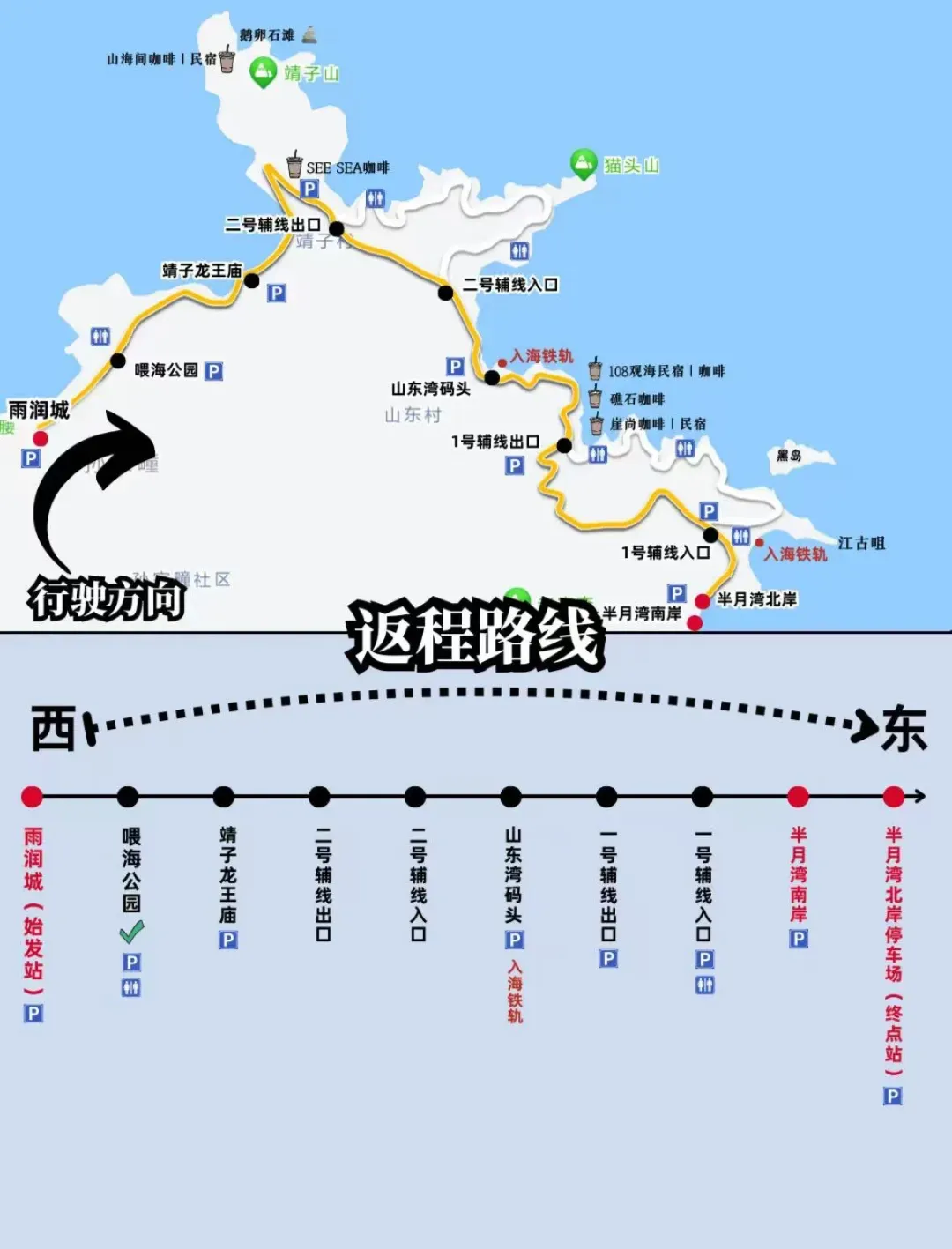 四号线,冬季运营,环海路全景观光巴士39元每个人,导航到半月湾北岸停车场站点上车,一米二以下儿童免费,但不提供座位,上车点和终点都是半月湾北岸停车场,七八月早晨八点到下午五点半,淡季八点半到四点半,灵活发车,间隔时间看客流量而定,仅在猫头山3号观景台和10号观景台停靠,停车游览后,需要回车上继续往前开,限制车次和座位,3号和10号观景台各自停靠15分钟,错过时间不回车票就失效了。 愿我的海 也能吹过你们的四季