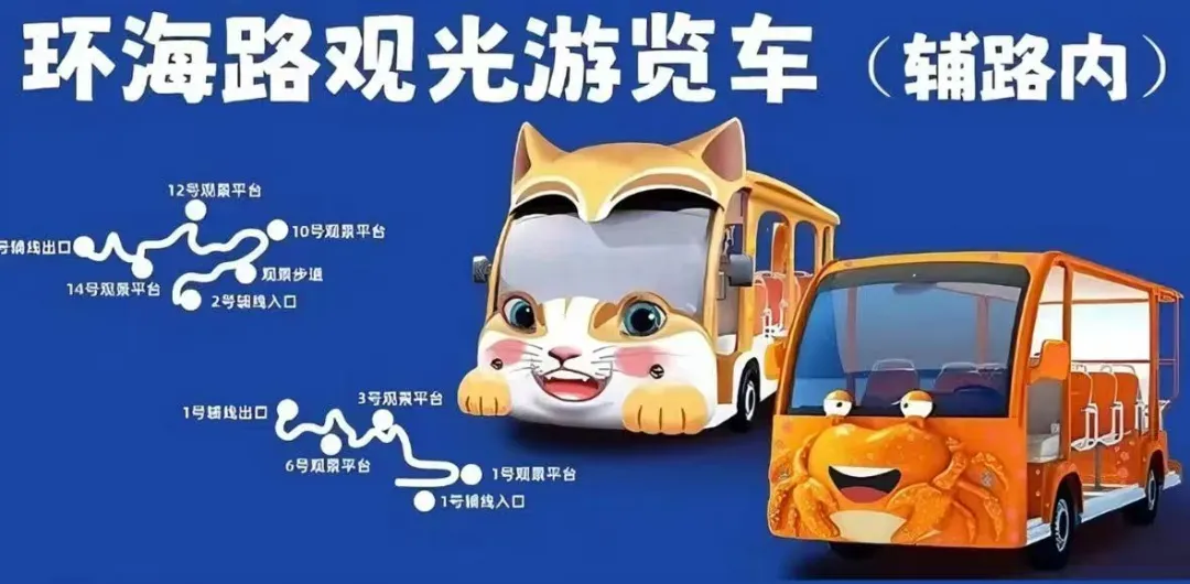 环海路观光游览车10元每个人,导航到半月湾北岸停车场购票,时间上午九点到下午四点半,流水发车根据客流量,游览车仅在环海路辅路一号线和二号线内往返停靠,一号线5个停车点,二号线6个停车点。冬季不运营。