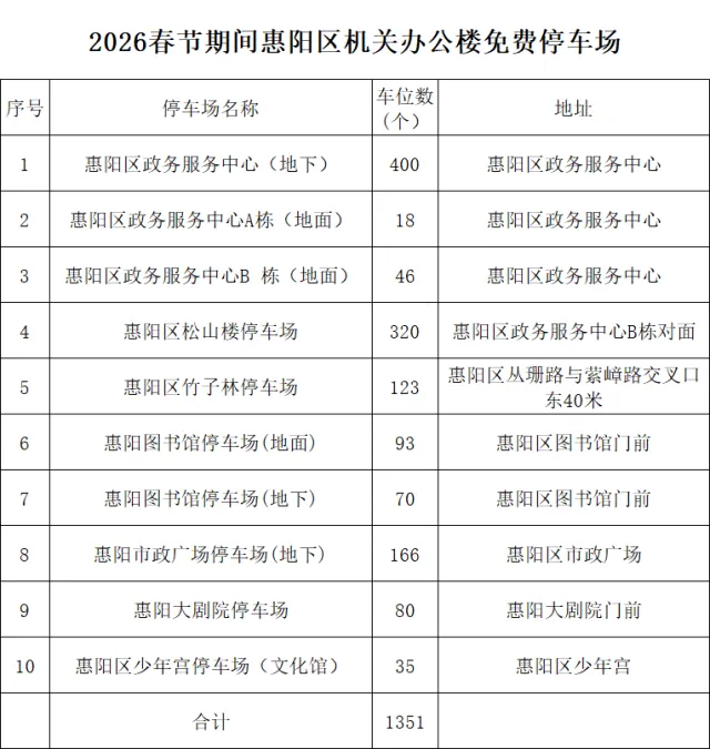 为方便市民春节期间出行停车,营造安全、有序、便利的节日环境,惠阳区委、区政府聚焦群众需求,以务实举措提升春节期间公共服务体验,决定在2026年春节假期期间,免费开放10处机关办公楼停车场,面向社会提供1351个公共停车位。