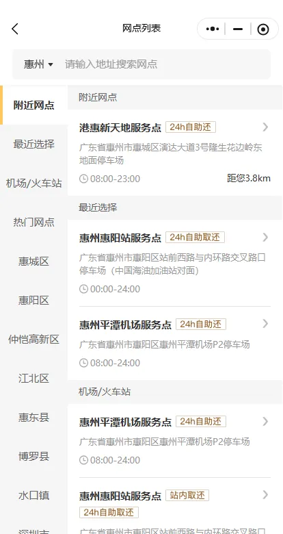 ③选择对应车型及用车时间即可,大部分网点支持24小时取还