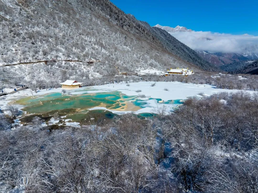 雪山环抱,银峰映日,冬日黄龙更显圣洁壮阔。