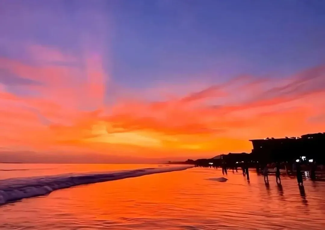 傍晚时分漫步沙滩上,看夕阳把天空染成橙红色,海面波光粼粼,就像撒了一层金粉,美到让人窒息。