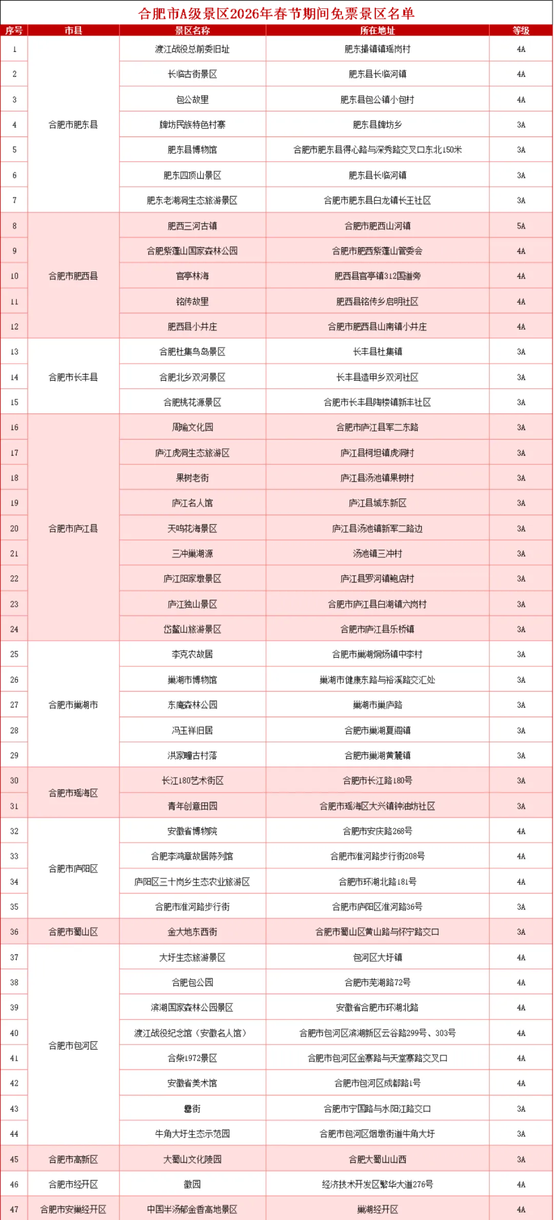 春节假期,凡持有“百戏入皖”门票、来肥机票(火车票)的游客,游览以下9家收费A级景区,可享受首次入园大门票免费优惠。(建议出行前关注景区公众号获取实时动态)。