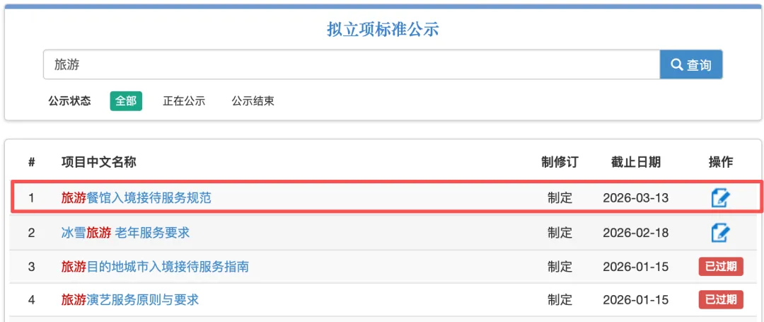近日,国家标准化管理委员会开展2026年第5批国家标准公开征求意见,全国旅游标准化技术委员会归口的国家标准《旅游餐馆入境接待服务规范》正在征求意见,征求意见截止时间为2026年3月13日。可登标准技术司网站征求意见公示网页(点击左下角“阅读原文”),查询项目信息和反馈意见建议。