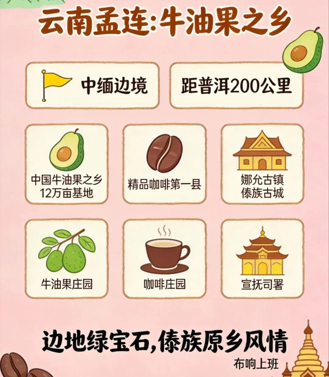 核心特色:娜允古镇(中国最后完整的傣族古镇,700多年土司文化)、咖啡庄园体验、牛油果种植基地、南传佛教寺庙群。