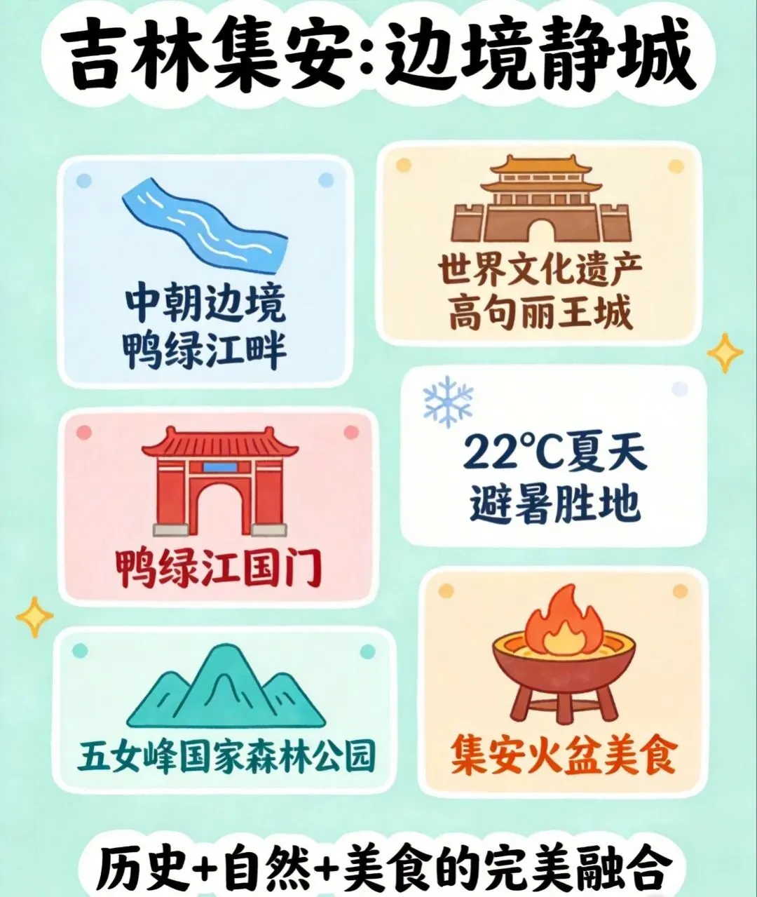 核心特色:高句丽王城遗址(将军坟、好太王碑等世界文化遗产)、鸭绿江边境风情、五女峰国家森林公园。
