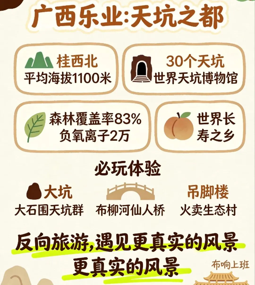 核心特色:大石围天坑群(全球7个超大型天坑)、布柳河仙人桥(世界最大天然石拱桥)、罗妹莲花洞(全球最大洞穴莲花盆群)。