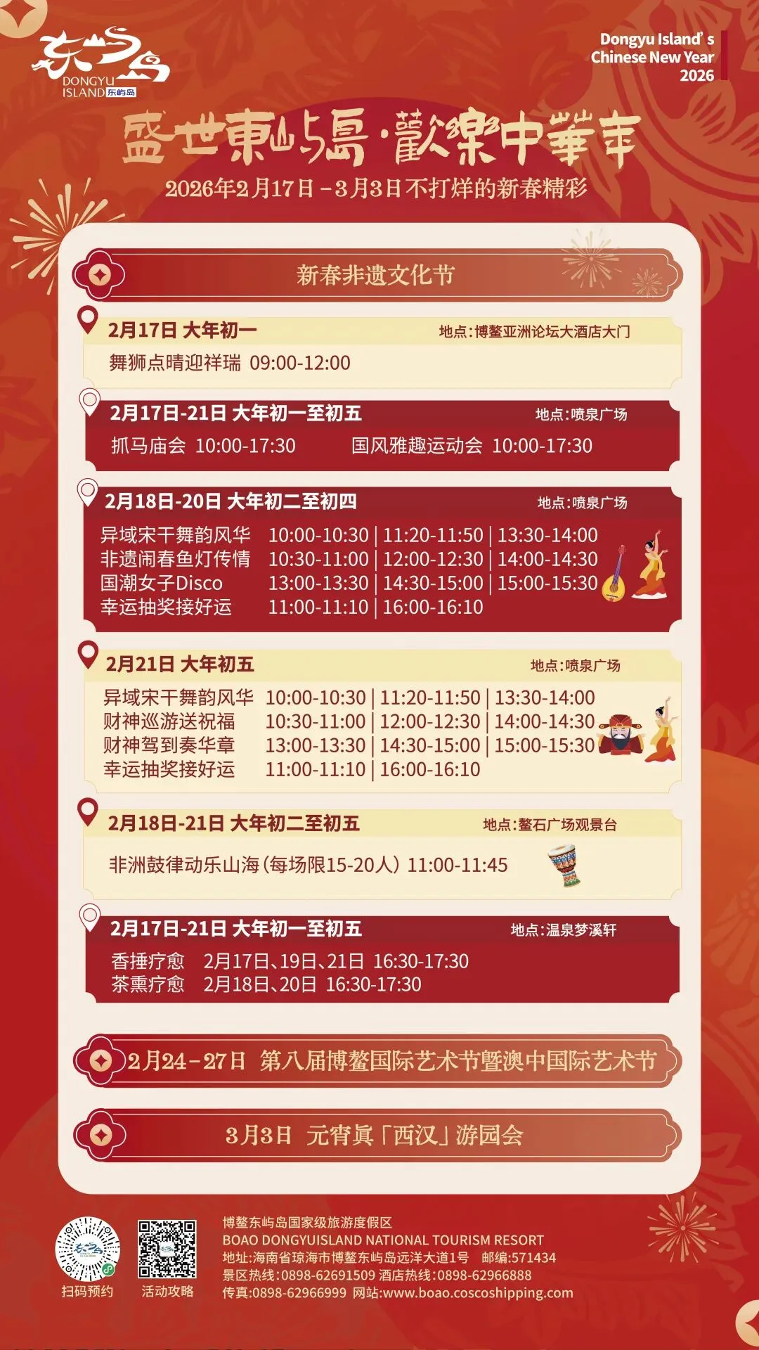 初一到元宵,度假区将以“盛世东屿岛·欢乐中华年”为主题,倾情呈献一场贯穿正月的文化盛宴。活动深度融合传统年俗与人文雅趣,既有舞狮点睛、非遗鱼灯等开年大戏,亦设投壶射箭、国潮律动、异域风情展演等古今交融的互动体验,让年味可观可感更可参与。初五“屿”你接财神巡游送福,元宵汉服巡游与灯谜雅集带宾客梦回西汉,于沉浸游艺中品味东方美学之韵。 年味不仅是热闹,更需心安处。东屿岛特设疗愈生活区,以香锤体验、茶熏冥想、温泉音疗等静心项目,为宾客舒缓节庆喧嚣,蓄养身心能量。每日两轮好运抽奖、无人机天幕秀、非遗竹竿舞及舂米舞等专场演出,更将节庆氛围推向高潮。日日有戏、天天有礼,东屿岛以文化为媒、以温情为笔,与八方来客共绘一幅动静相宜、古今和鸣的新春画卷。