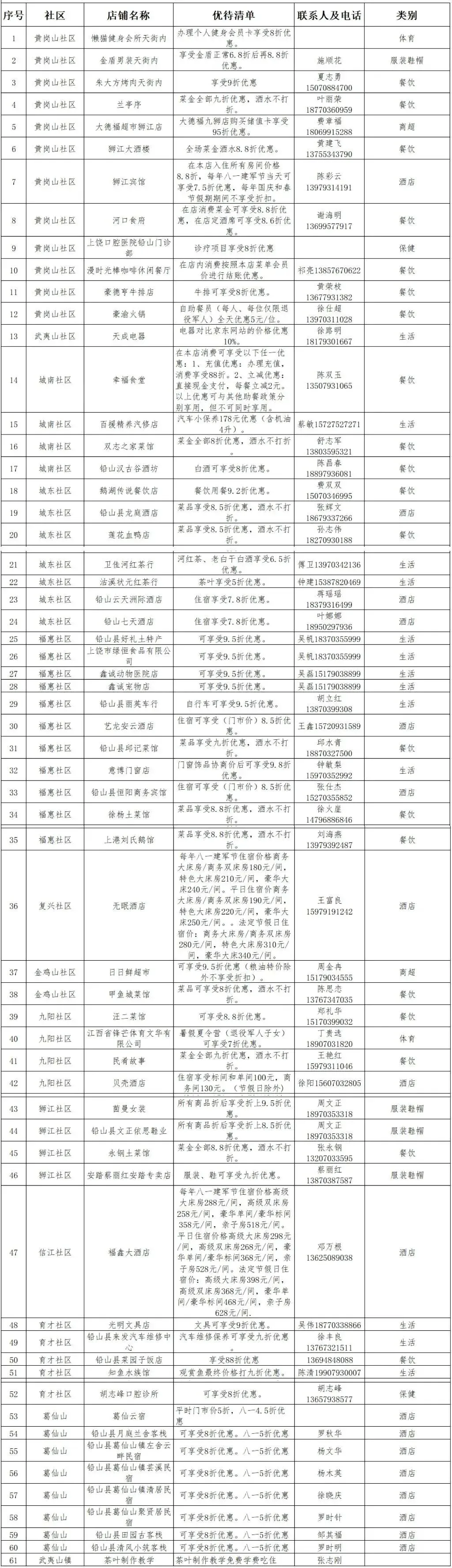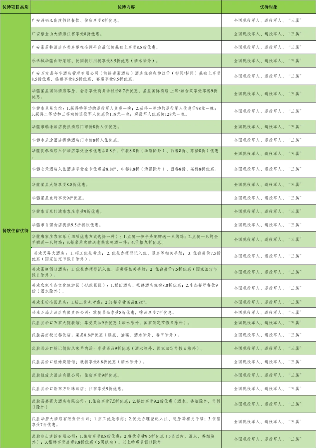 近日 上饶市铅山县退役军人事务局 发布了第一批优待项目清单 涵盖餐饮住宿、培训就业 生活服务、医疗康养等多个领域 为军人军属和退役军人 提供专属折扣、优先服务 节日特色套餐等优待内容 具体优待清单 👇👇👇