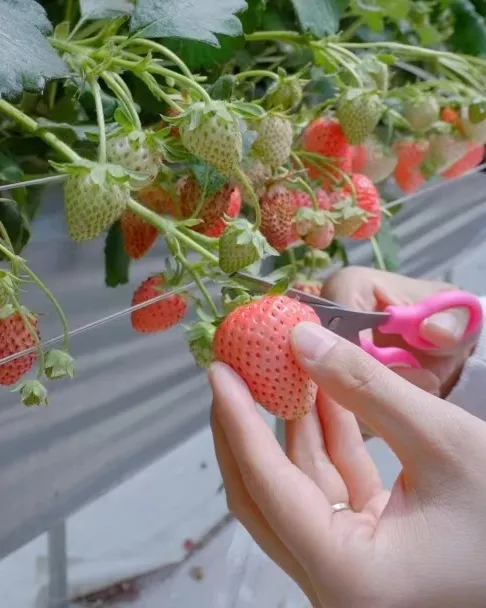 水师温泉的草莓温室整体占地面积1500平方米,温室里一共种植有3种不同品种的草莓,桃香草莓:顾名思义,这种草莓具有浓郁的桃子香味,果实呈圆锥形,甘甜爽口。香野草莓:生长周期较短,产量高,比常规草莓提前一个月就能上市。高糖草莓(甘):这个品种是16年由日本引进,果肉极其细腻,果味浓郁,甜美多汁,具有极高的甜度。