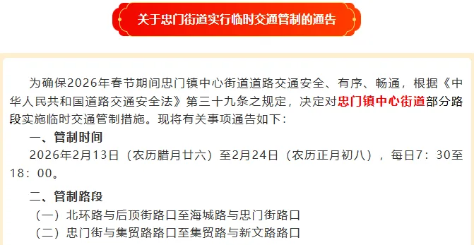 春节期间部分路段交通管制