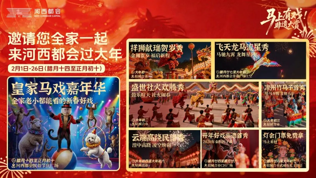 年是团圆的欢喜,是民俗的传承,是烟火的温暖。这个春节,不必远走他乡,不必寻觅别处,武威河西都会新春非遗大赏,藏着最地道、最浓郁、最热闹的凉州年味。有马戏的欢乐、有光影的浪漫、有非遗的厚重、有秦腔的韵味、有篝火的热情,更有实实在在的新春福利。