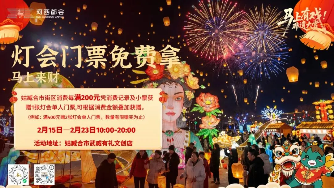 2月15日—2月23日,前往姑臧合市消费,单笔满200元即可免费领取灯会门票,且福利可叠加使用!逛吃特色美食、选购新春好物,一站式满足味蕾与购物需求,还能免费解锁璀璨灯会,赏流光溢彩的新春灯景,逛吃、赏灯、打卡一举三得,性价比直接拉满,让你开心过节,轻松省钱!